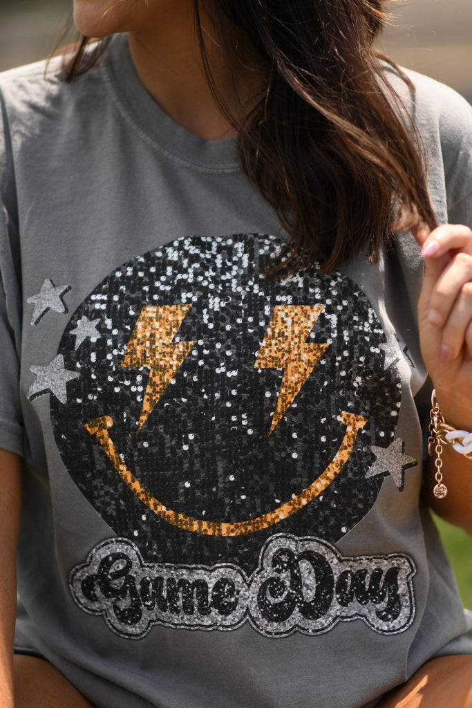Game Day Smiley Faux Glitter Tee